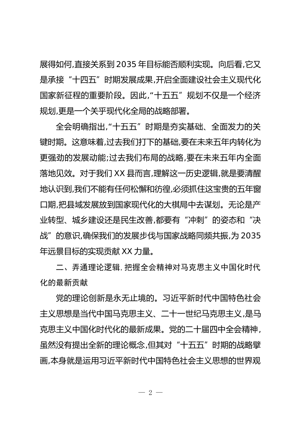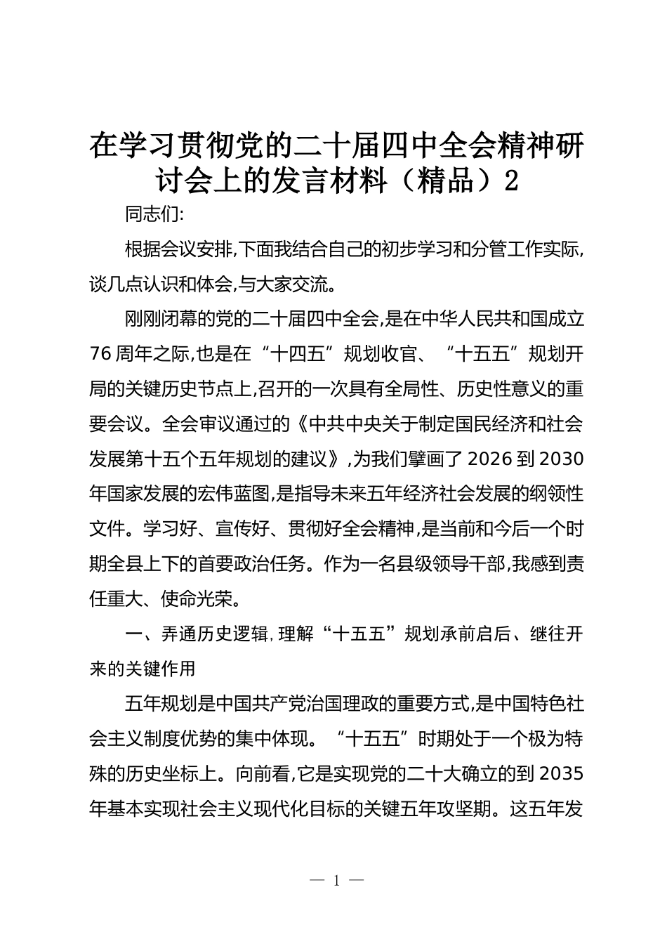 在學(xué)習(xí)貫徹黨的二十屆四中全會(huì)精神研討會(huì)上的發(fā)言材料(精品)2同志們:根據(jù)會(huì)議安排,下面我結(jié)合自己的初步學(xué)習(xí)和分管工作實(shí)際,談幾點(diǎn)認(rèn)識(shí)和體會(huì),與大家交流。剛剛閉幕的黨的二十屆四中全會(huì),是在中華人民共和國成立76周年之際,也是在“十四五”規(guī)劃收官、“十五五”規(guī)劃開局的關(guān)鍵歷史節(jié)點(diǎn)上,召開的一次具有全局性、歷史性意義的重要會(huì)議。全會(huì)審議通過的《中共中央關(guān)于制定國民經(jīng)濟(jì)和社會(huì)發(fā)展第十五個(gè)五年規(guī)劃的建議》,為我們擘畫了2026到2030年國家發(fā)展的宏偉藍(lán)圖,是指導(dǎo)未來五年經(jīng)濟(jì)社會(huì)發(fā)展的綱領(lǐng)性文件。學(xué)習(xí)好、宣傳好、貫徹好全會(huì)精神,是當(dāng)前和今后一個(gè)時(shí)期全縣上...