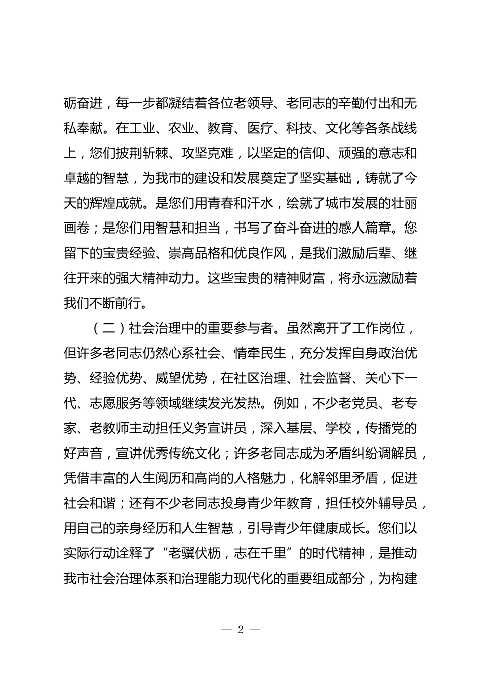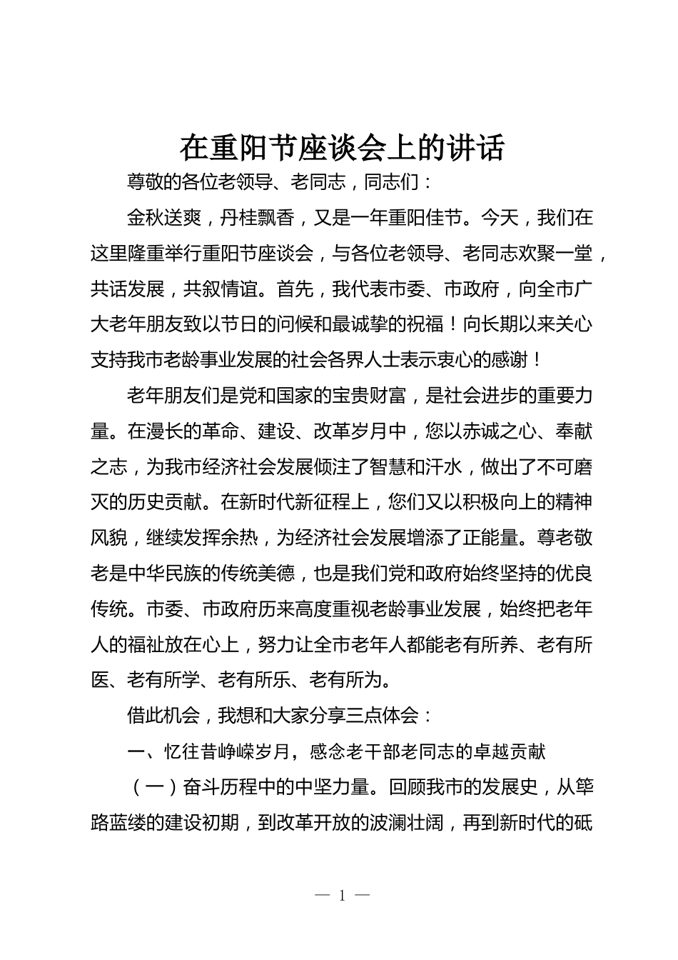 在重陽(yáng)節(jié)座談會(huì)上的講話尊敬的各位老領(lǐng)導(dǎo)、老同志,同志們:金秋送爽,丹桂飄香,又是一年重陽(yáng)佳節(jié)。今天,我們?cè)谶@里隆重舉行重陽(yáng)節(jié)座談會(huì),與各位老領(lǐng)導(dǎo)、老同志歡聚一堂,共話發(fā)展,共敘情誼。首先,我代表市委、市政府,向全市廣大老年朋友致以節(jié)日的問(wèn)候和最誠(chéng)摯的祝福!向長(zhǎng)期以來(lái)關(guān)心支持我市老齡事業(yè)發(fā)展的社會(huì)各界人士表示衷心的感謝!老年朋友們是黨和國(guó)家的寶貴財(cái)富,是社會(huì)進(jìn)步的重要力量。在漫長(zhǎng)的革命、建設(shè)、改革歲月中,您以赤誠(chéng)之心、奉獻(xiàn)之志,為我市經(jīng)濟(jì)社會(huì)發(fā)展傾注了智慧和汗水,做出了不可磨滅的歷史貢獻(xiàn)。在新時(shí)代新征程上,您們又以積極向上的精...