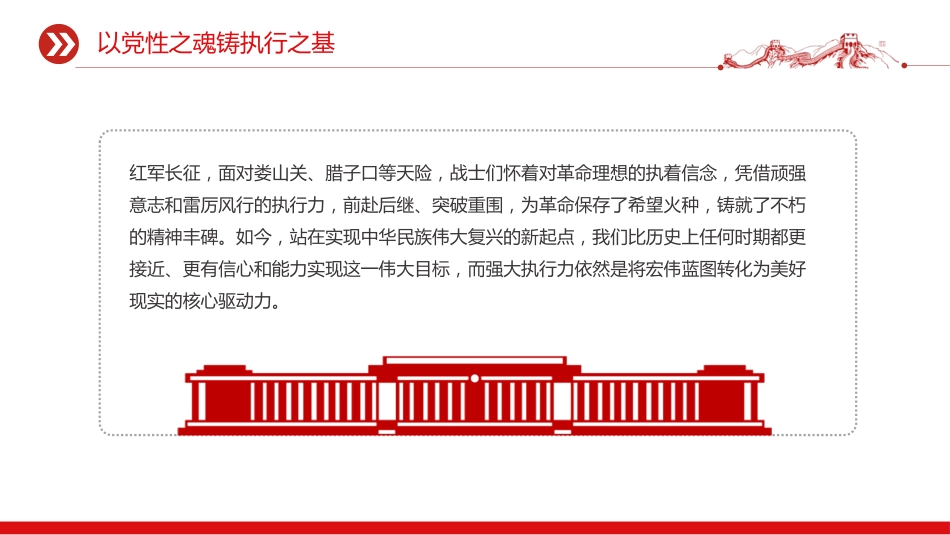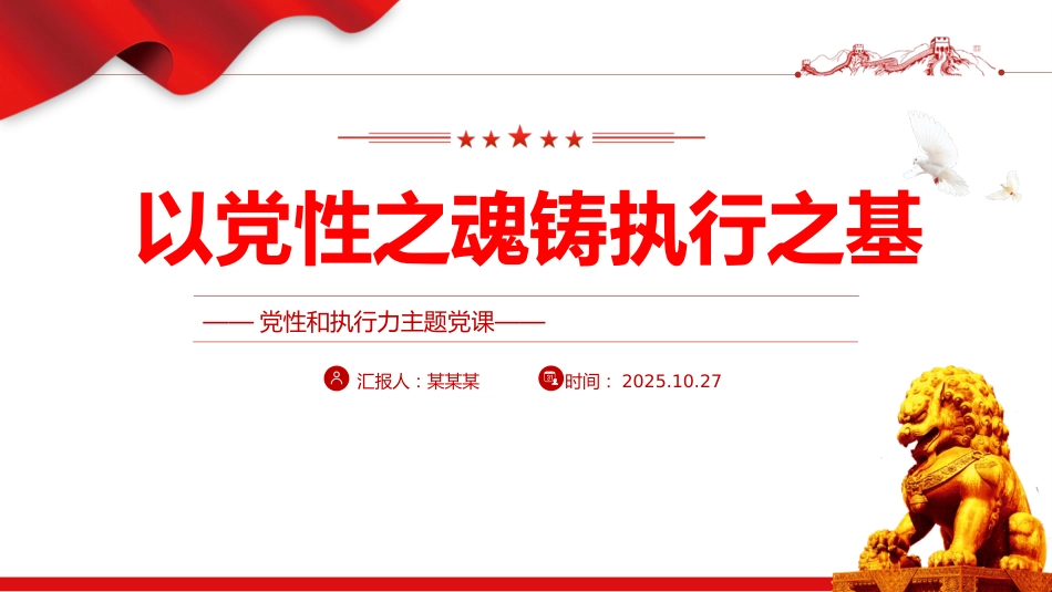 匯報人:某某某時間:2025.10.27以黨性之魂鑄執(zhí)行之基——黨性和執(zhí)行力主題黨課——以黨性之魂鑄執(zhí)行之基在新時代波瀾壯闊的征程中,“一分部署,九分落實”是鏗鏘有力的行動號角。從新民主主義革命的硝煙戰(zhàn)火,到社會主義建設(shè)的探索奮進(jìn),再到改革開放的偉大變革,中國共產(chǎn)黨之所以能帶領(lǐng)中國人民跨越重重艱難險阻,創(chuàng)造一個又一個彪炳史冊的奇跡,強(qiáng)大且堅定不移的執(zhí)行力是關(guān)鍵密碼。紅軍長征,面對婁山關(guān)、臘子口等天險,戰(zhàn)士們懷著對革命理想的執(zhí)著信念,憑借頑強(qiáng)意志和雷厲風(fēng)行的執(zhí)行力,前赴后繼、突破重圍,為革命保存了希望火種,鑄就了不朽的精神豐碑。如今,站...
