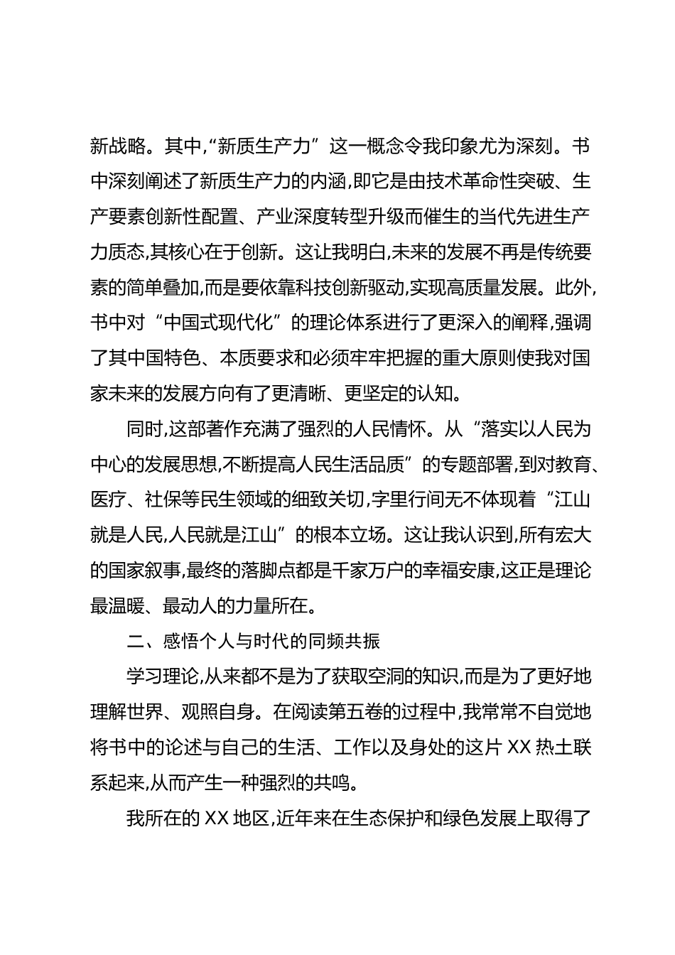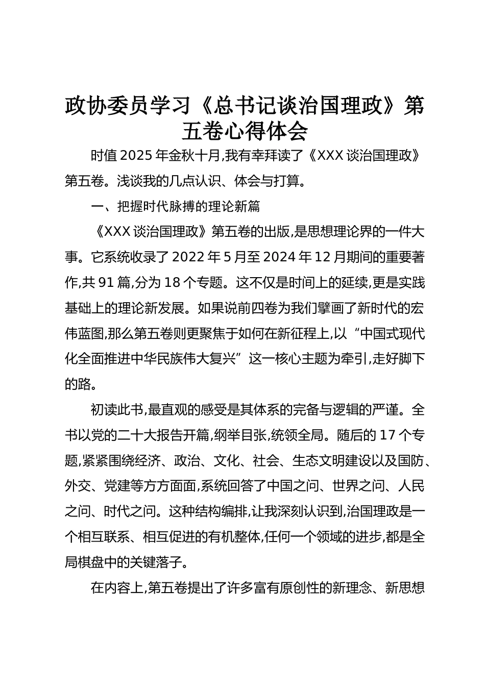 政協(xié)委員學(xué)習(xí)《總書記談治國理政》第五卷心得體會時值2025年金秋十月,我有幸拜讀了《XXX談治國理政》第五卷。淺談我的幾點(diǎn)認(rèn)識、體會與打算。一、把握時代脈搏的理論新篇《XXX談治國理政》第五卷的出版,是思想理論界的一件大事。它系統(tǒng)收錄了2022年5月至2024年12月期間的重要著作,共91篇,分為18個專題。這不僅是時間上的延續(xù),更是實(shí)踐基礎(chǔ)上的理論新發(fā)展。如果說前四卷為我們擘畫了新時代的宏偉藍(lán)圖,那么第五卷則更聚焦于如何在新征程上,以“中國式現(xiàn)代化全面推進(jìn)中華民族偉大復(fù)興”這一核心主題為牽引,走好腳下的路。初讀此書,最直觀的感受是其體系的完備與邏輯的嚴(yán)謹(jǐn)。...