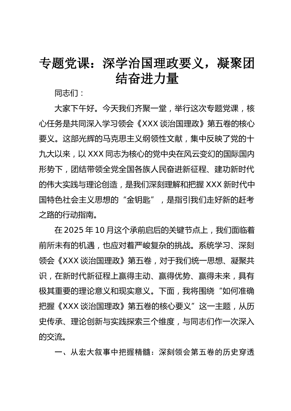 專題黨課:深學(xué)治國理政要義,凝聚團結(jié)奮進力量同志們:大家下午好。今天我們齊聚一堂,舉行這次專題黨課,核心任務(wù)是共同深入學(xué)習(xí)領(lǐng)會《XXX談治國理政》第五卷的核心要義。這部光輝的馬克思主義綱領(lǐng)性文獻,集中反映了黨的十九大以來,以XXX同志為核心的黨中央在風(fēng)云變幻的國際國內(nèi)形勢下,團結(jié)帶領(lǐng)全黨全國各族人民奮進新征程、建功新時代的偉大實踐與理論創(chuàng)造,是我們深刻理解和把握XXX新時代中國特色社會主義思想的“金鑰匙”,是指引我們走好新的趕考之路的行動指南。在2025年10月這個承前啟后的關(guān)鍵節(jié)點上,我們面臨著前所未有的機遇,也應(yīng)對著嚴(yán)峻復(fù)雜的挑戰(zhàn)。系...