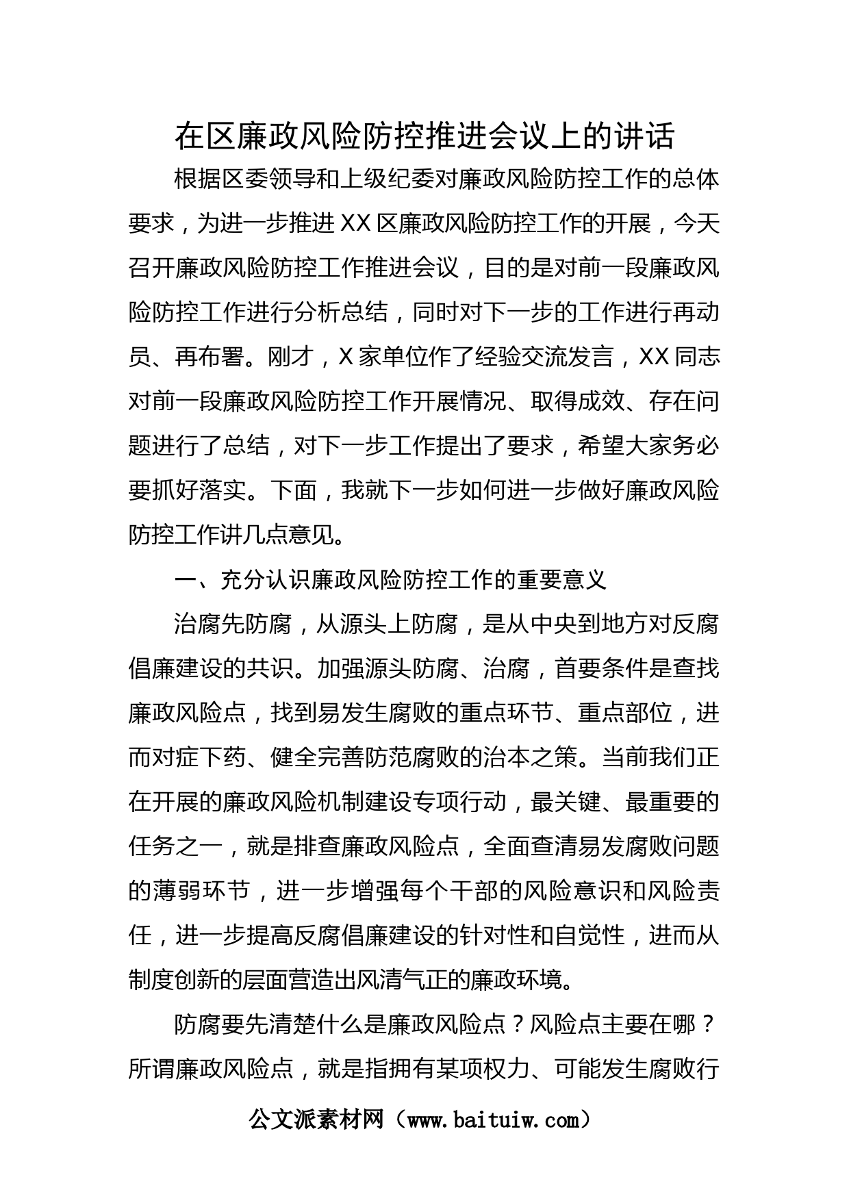 在區(qū)廉政風(fēng)險防控推進(jìn)會議上的講話根據(jù)區(qū)委領(lǐng)導(dǎo)和上級紀(jì)委對廉政風(fēng)險防控工作的總體要求,為進(jìn)一步推進(jìn)XX區(qū)廉政風(fēng)險防控工作的開展,今天召開廉政風(fēng)險防控工作推進(jìn)會議,目的是對前一段廉政風(fēng)險防控工作進(jìn)行分析總結(jié),同時對下一步的工作進(jìn)行再動員、再布署。剛才,X家單位作了經(jīng)驗交流發(fā)言,XX同志對前一段廉政風(fēng)險防控工作開展情況、取得成效、存在問題進(jìn)行了總結(jié),對下一步工作提出了要求,希望大家務(wù)必要抓好落實。下面,我就下一步如何進(jìn)一步做好廉政風(fēng)險防控工作講幾點意見。一、充分認(rèn)識廉政風(fēng)險防控工作的重要意義治腐先防腐,從源頭上防腐,是從中央到地方對反...