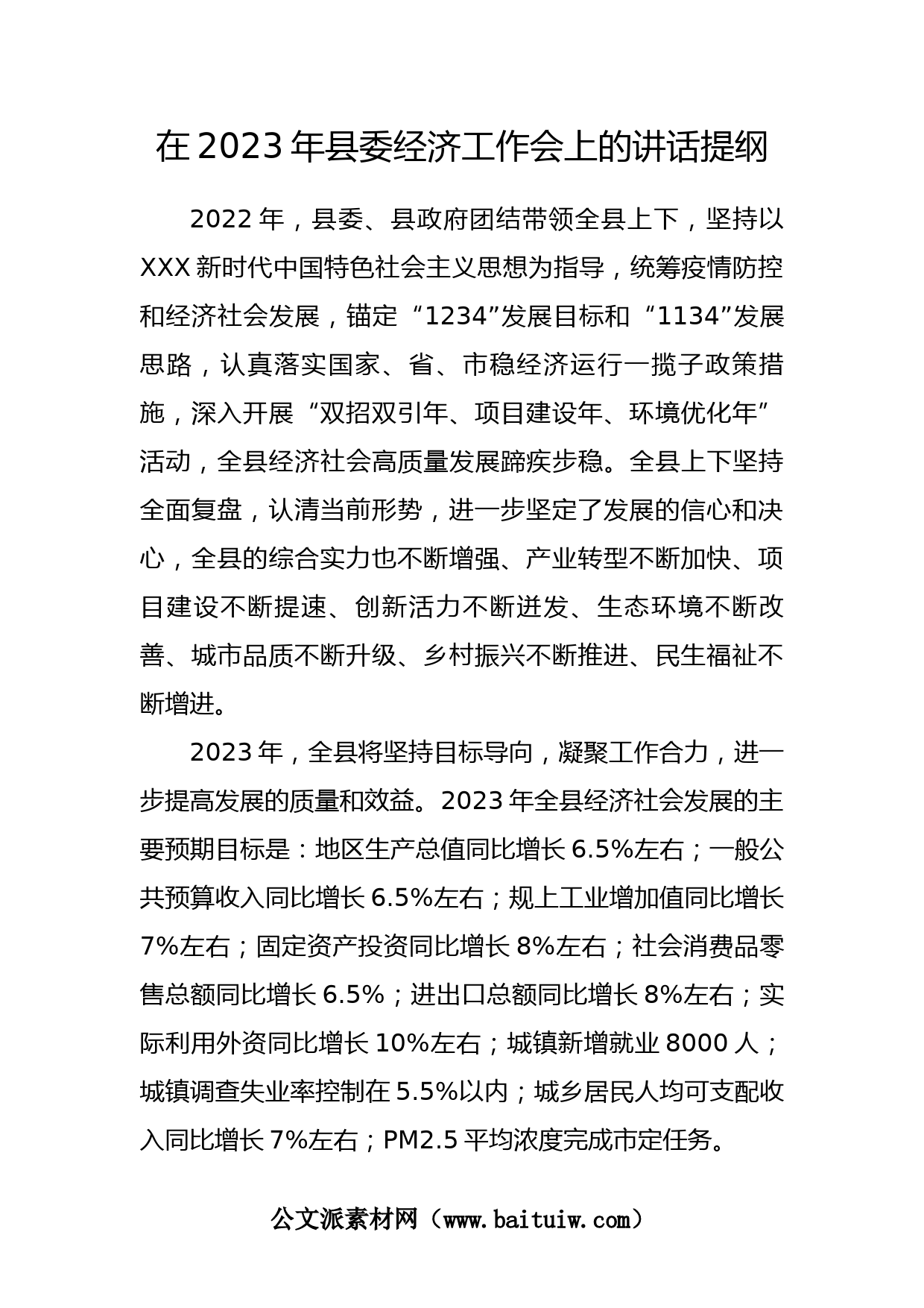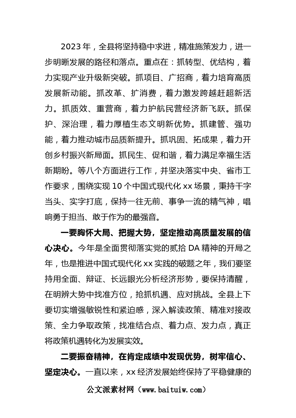 在2023年縣委經濟工作會上的講話提綱2022年,縣委、縣政府團結帶領全縣上下,堅持以XXX新時代中國特色社會主義思想為指導,統(tǒng)籌疫情防控和經濟社會發(fā)展,錨定“1234”發(fā)展目標和“1134”發(fā)展思路,認真落實國家、省、市穩(wěn)經濟運行一攬子政策措施,深入開展“雙招雙引年、項目建設年、環(huán)境優(yōu)化年”活動,全縣經濟社會高質量發(fā)展蹄疾步穩(wěn)。全縣上下堅持全面復盤,認清當前形勢,進一步堅定了發(fā)展的信心和決心,全縣的綜合實力也不斷增強、產業(yè)轉型不斷加快、項目建設不斷提速、創(chuàng)新活力不斷迸發(fā)、生態(tài)環(huán)境不斷改善、城市品質不斷升級、鄉(xiāng)村振興不斷推進、民生福祉不斷增進...