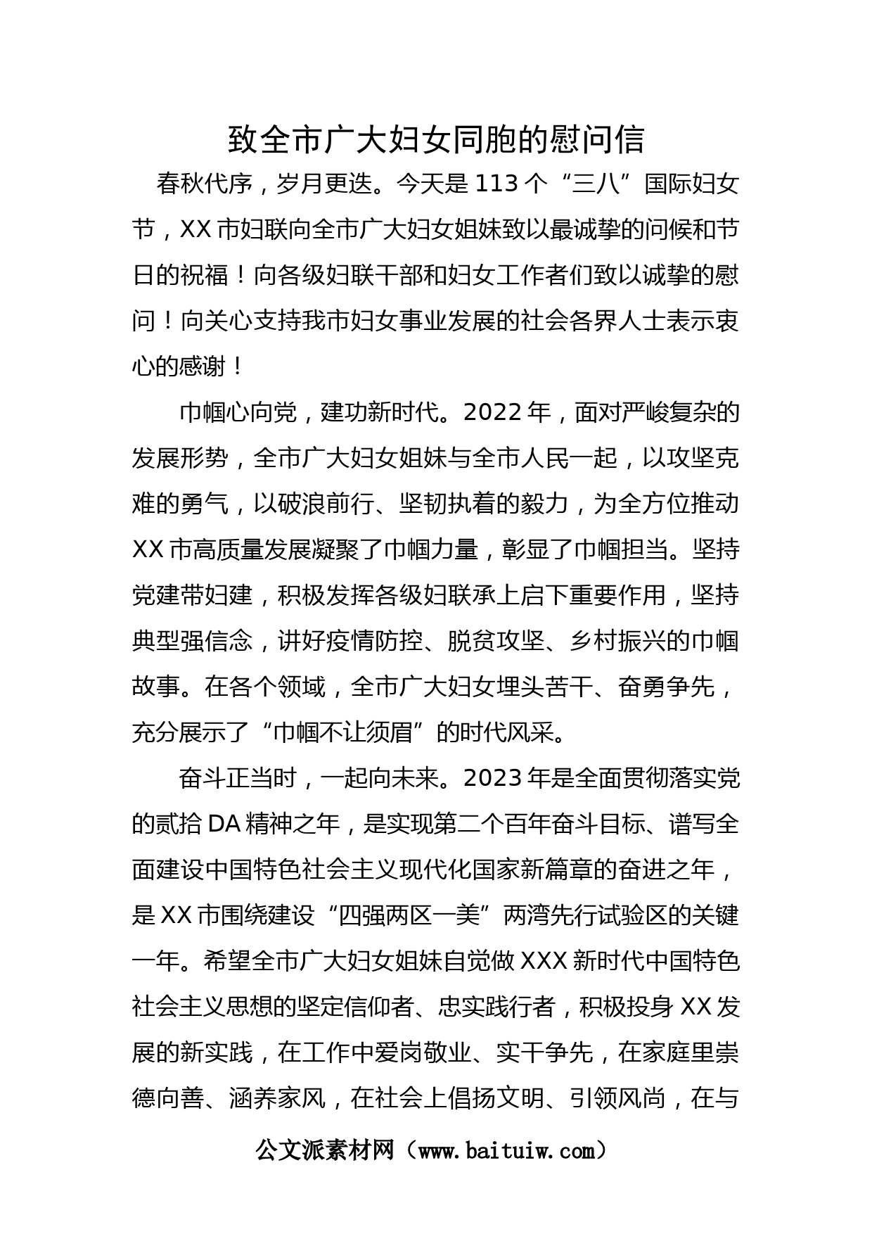 致全市廣大婦女同胞的慰問信VIP免費(fèi)