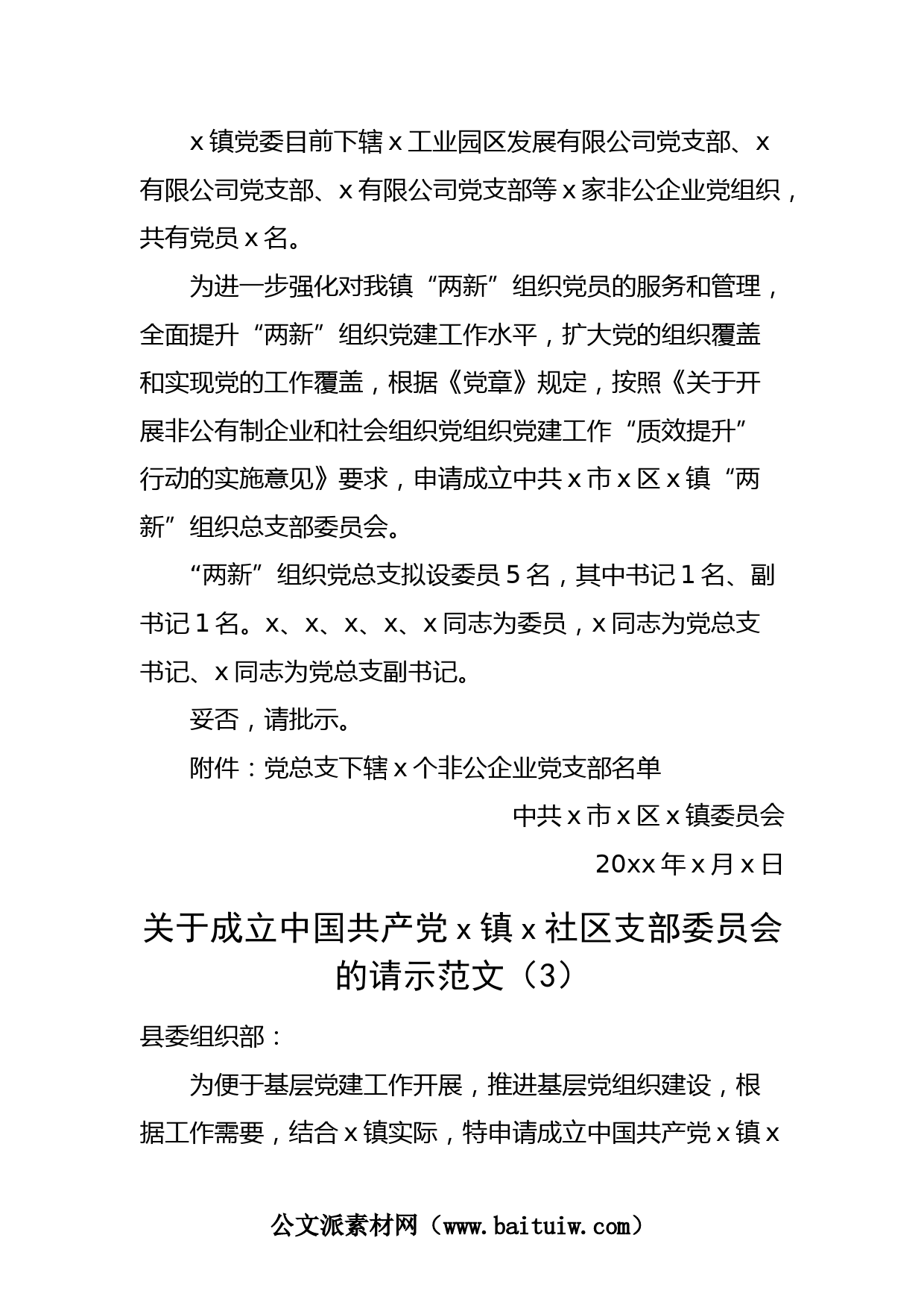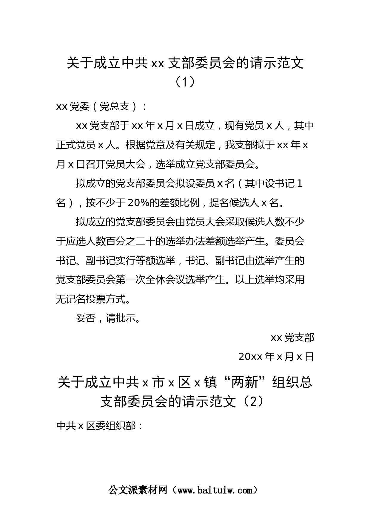 關(guān)于成立中共xx支部委員會的請示范文(1)xx黨委(黨總支):xx黨支部于xx年x月x日成立,現(xiàn)有黨員x人,其中正式黨員x人。根據(jù)黨章及有關(guān)規(guī)定,我支部擬于xx年x月x日召開黨員大會,選舉成立黨支部委員會。擬成立的黨支部委員會擬設(shè)委員x名(其中設(shè)書記1名),按不少于20%的差額比例,提名候選人x名。擬成立的黨支部委員會由黨員大會采取候選人數(shù)不少于應(yīng)選人數(shù)百分之二十的選舉辦法差額選舉產(chǎn)生。委員會書記、副書記實行等額選舉,書記、副書記由選舉產(chǎn)生的黨支部委員會第一次全體會議選舉產(chǎn)生。以上選舉均采用無記名投票方式。妥否,請批示。xx黨支部20xx年x月x日關(guān)于成...