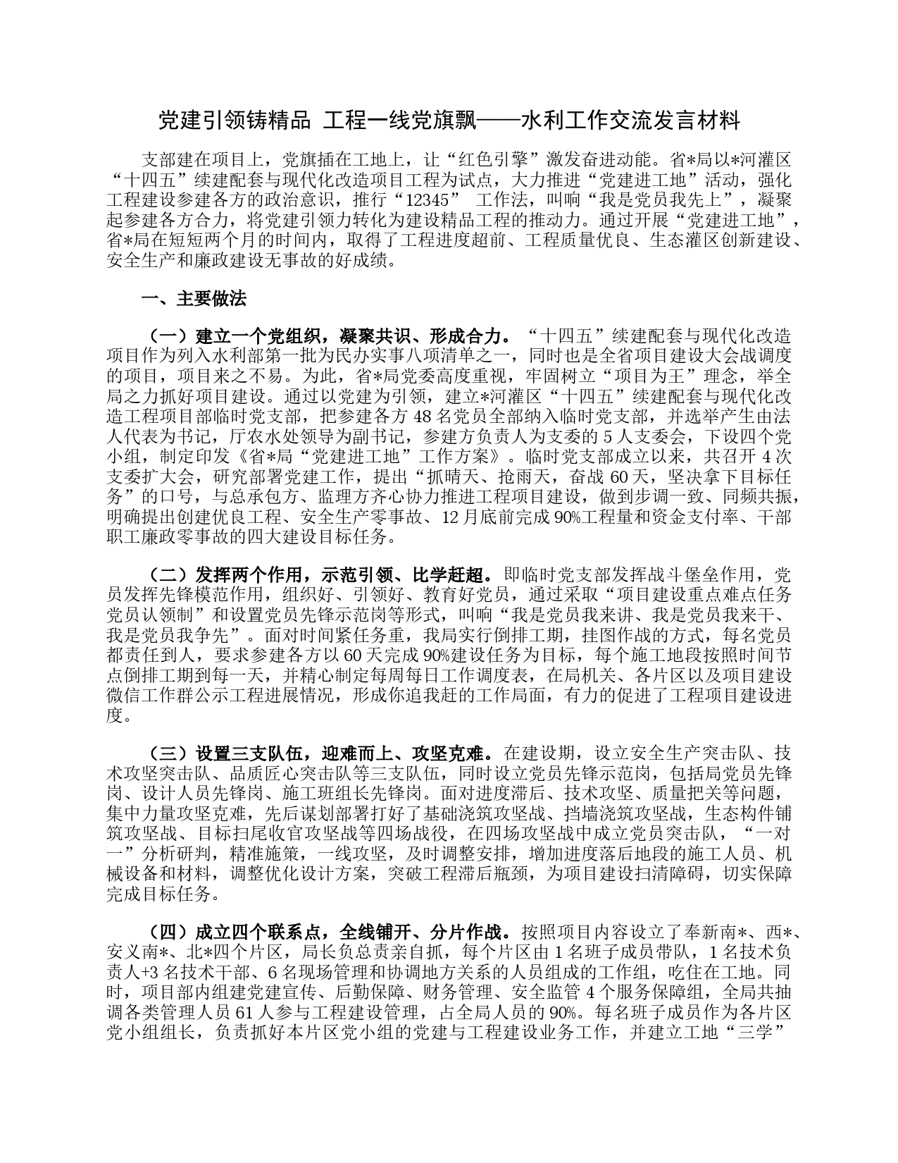 黨建引領(lǐng)鑄精品工程一線黨旗飄——水利工作交流發(fā)言材料VIP免費(fèi)