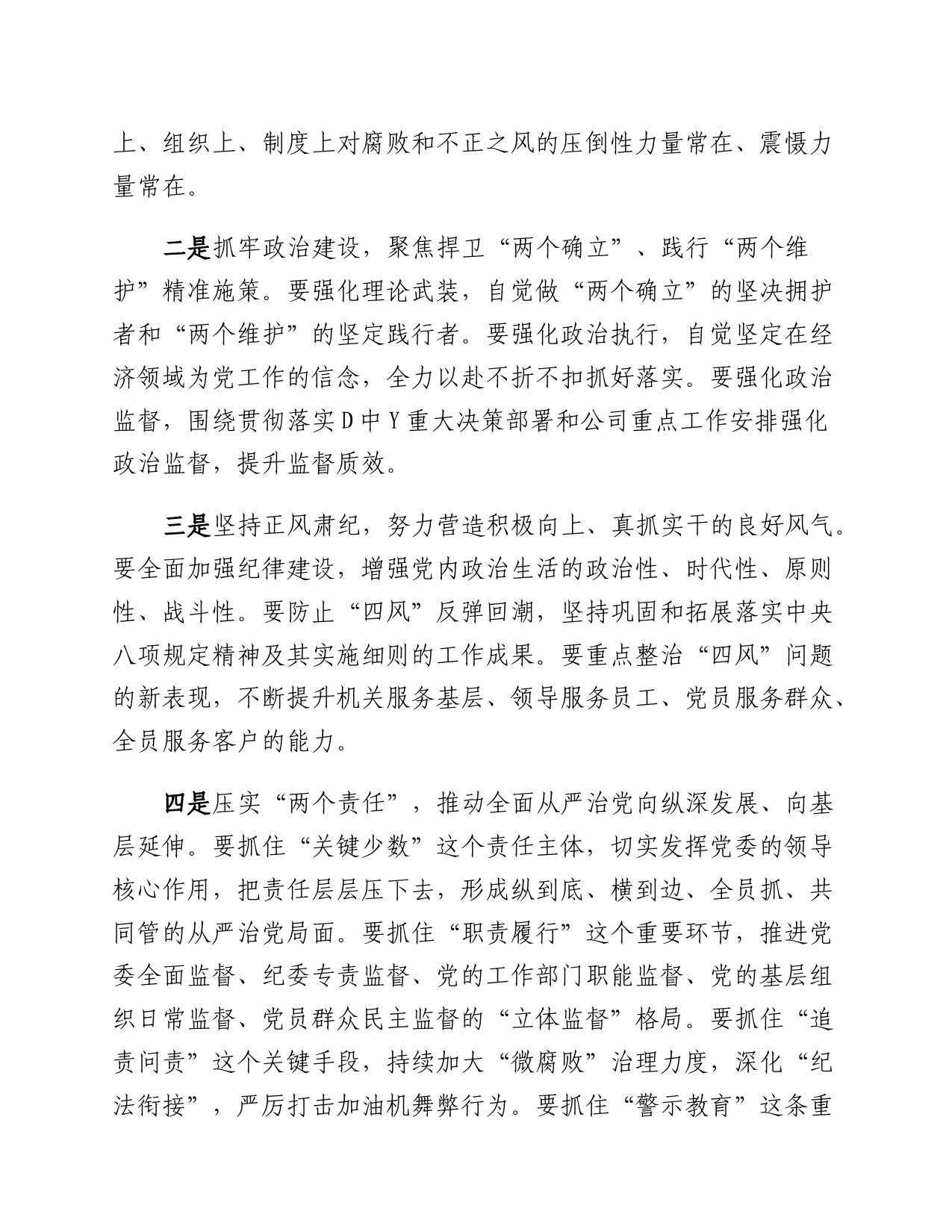 黨委書記在2023年黨風廉政建設和反腐敗工作會議上的講話同志們:此次會議是以XJP新時代中國特色社會主義思想為指導,深入學習黨的XX大精神,全面落實二十屆中央紀委二次全會、公司黨風廉政建設和反腐敗工作會議部署,總結2022年工作,安排2023年重點任務,推進紀檢工作高質量發(fā)展,以全面從嚴治黨向縱向延伸的新成效,為進一步深化企業(yè)戰(zhàn)略部署提供堅強保障。過去一年,面對復雜嚴峻的內外部形勢和艱巨繁重的工作任務,公司黨委團結帶領廣大干部員工,堅持穩(wěn)中求進,奮輯篤行,戰(zhàn)勝了諸多風險挑戰(zhàn),政治建設持續(xù)強化,管黨治黨政治責任充分落實,政治生態(tài)更加優(yōu)化,“反...