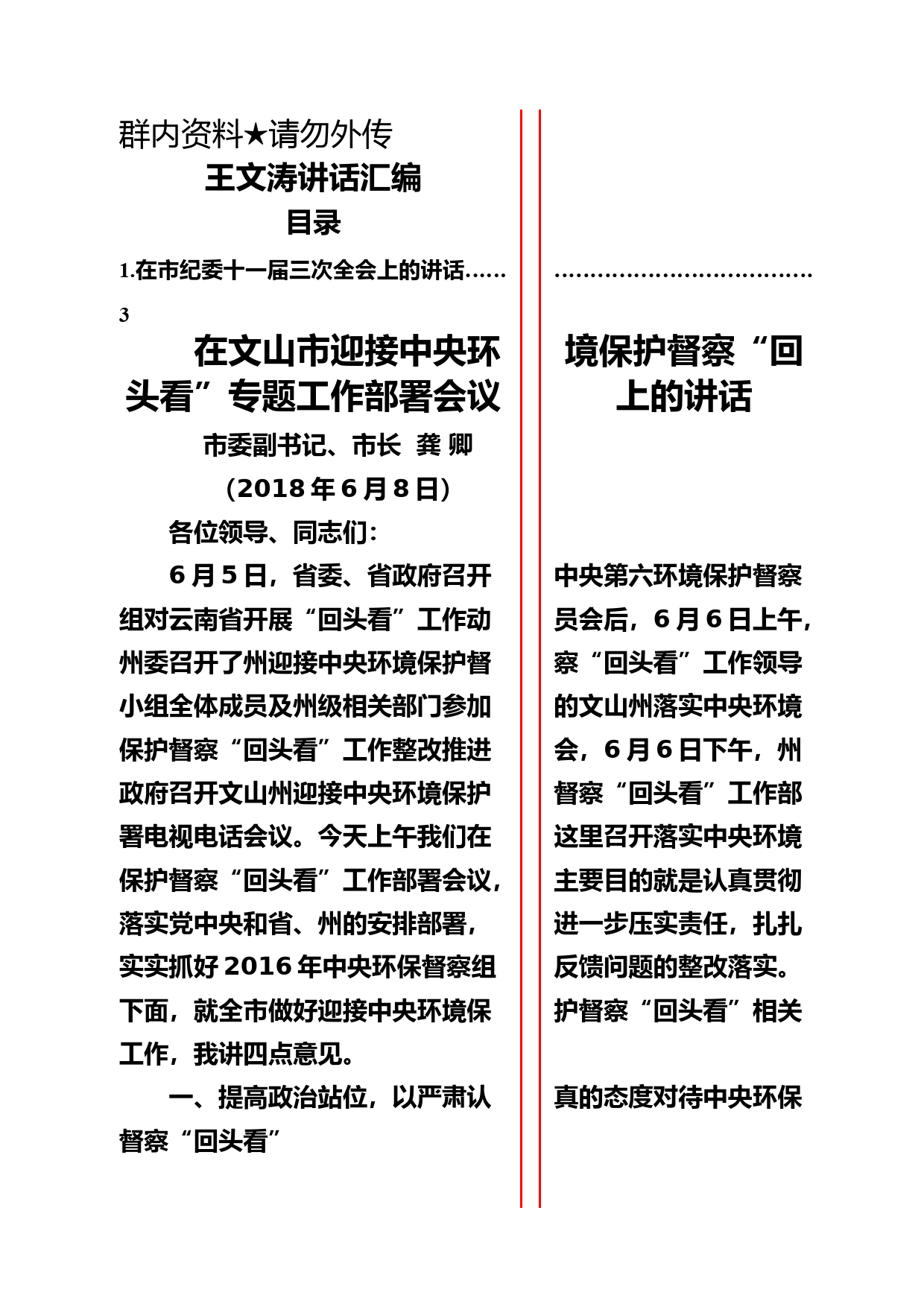 群內(nèi)資料★請勿外傳………………………………王文濤講話匯編境保護督察“回目錄上的講話1.在市紀委十一屆三次全會上的講話……中央第六環(huán)境保護督察3員會后,6月6日上午,察“回頭看”工作領(lǐng)導在文山市迎接中央環(huán)的文山州落實中央環(huán)境頭看”專題工作部署會議會,6月6日下午,州督察“回頭看”工作部市委副書記、市長龔卿這里召開落實中央環(huán)境(2018年6月8日)主要目的就是認真貫徹各位領(lǐng)導、同志們:進一步壓實責任,扎扎6月5日,省委、省政府召開反饋問題的整改落實。組對云南省開展“回頭看”工作動護督察“回頭看”相關(guān)州委召開了州迎接中央環(huán)境保護督小組全體成員及...