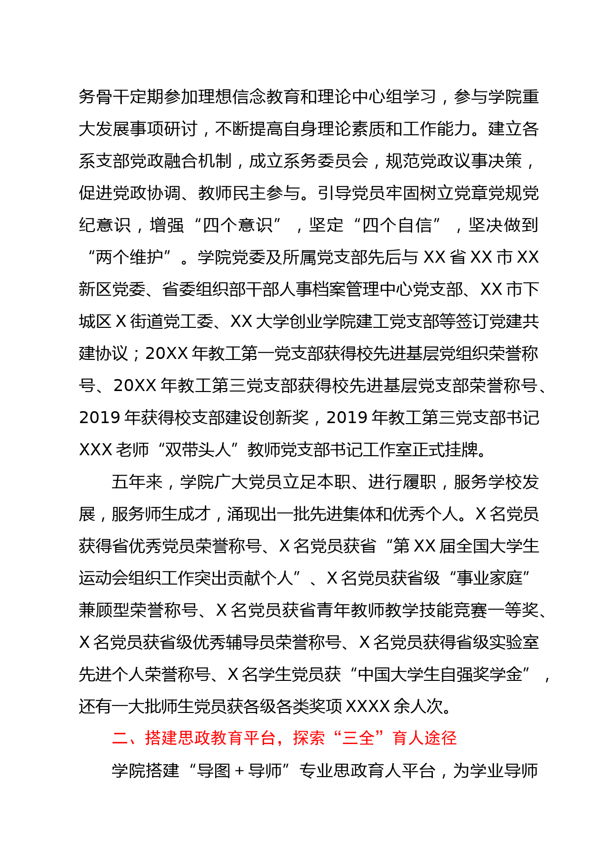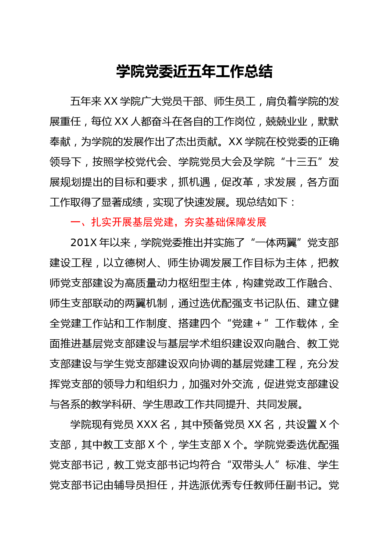 學(xué)院黨委近五年工作總結(jié)五年來XX學(xué)院廣大黨員干部、師生員工,肩負(fù)著學(xué)院的發(fā)展重任,每位XX人都奮斗在各自的工作崗位,兢兢業(yè)業(yè),默默奉獻(xiàn),為學(xué)院的發(fā)展作出了杰出貢獻(xiàn)。XX學(xué)院在校黨委的正確領(lǐng)導(dǎo)下,按照學(xué)校黨代會、學(xué)院黨員大會及學(xué)院“十三五”發(fā)展規(guī)劃提出的目標(biāo)和要求,抓機(jī)遇,促改革,求發(fā)展,各方面工作取得了顯著成績,實(shí)現(xiàn)了快速發(fā)展?,F(xiàn)總結(jié)如下:一、扎實(shí)開展基層黨建,夯實(shí)基礎(chǔ)保障發(fā)展201X年以來,學(xué)院黨委推出并實(shí)施了“一體兩翼”黨支部建設(shè)工程,以立德樹人、師生協(xié)調(diào)發(fā)展工作目標(biāo)為主體,把教師黨支部建設(shè)為高質(zhì)量動力樞紐型主體,構(gòu)建黨政工作融合...